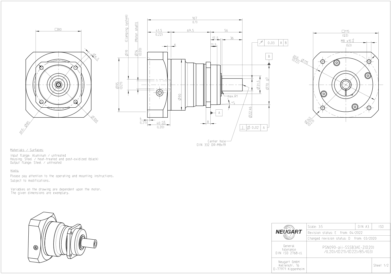 PSN series precision gearbox part model size drawing:Structure and dimension drawing of PSN70 gearbox